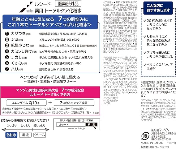 精製水、1,3-ブチレングリコール、エタノール、濃グリセリン、ポリエチレングリコール1500、ポリオキシプロピレンメチルグルコシド、ポリオキシエチレン硬化ヒマシ油、グリセリンモノ2-エチルヘキシルエーテル、クエン酸、l-メントール、N-アセチル-L-ヒドロキシプロリン、ユビデカレノン、ポリエチレングリコール、ヒアルロン酸ナトリウム(2)、ハマメリスエキス、グリセリル-N-(2-メタクリロイルオキシエチル)カルバメート・メタクリル酸ステアリル