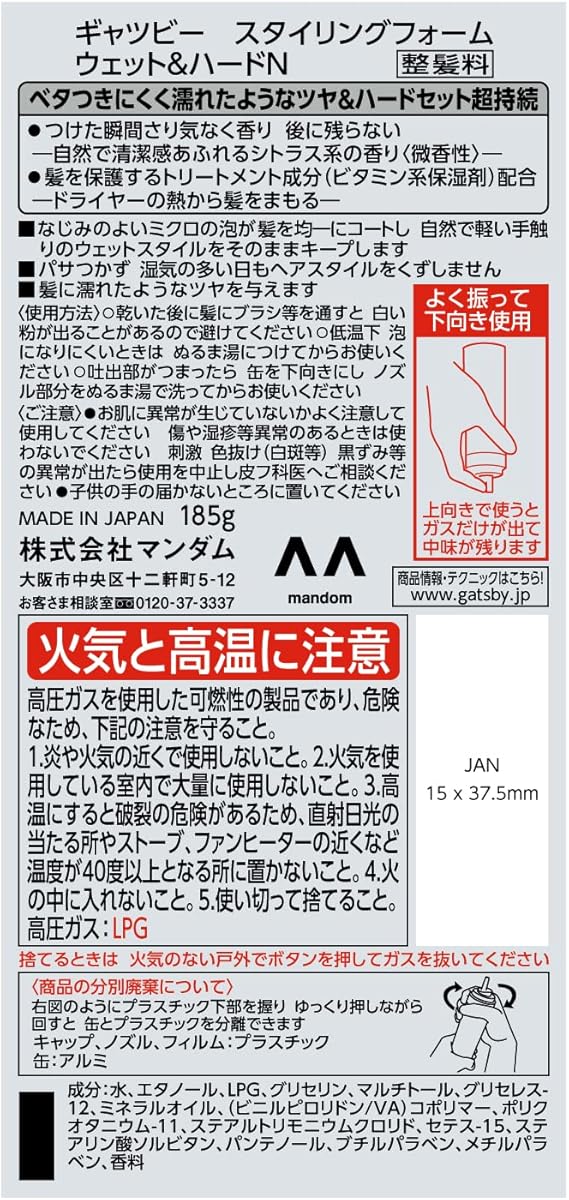 水、エタノール、LPG、グリセリン、マルチトール、グリセレス-12、ミネラルオイル、(ビニルピロリドン/VA)コポリマー、ポリクオタニウム-11、ステアルトリモニウムクロリド、セテス-15、ステアリン酸ソルビタン、パンテノール、ブチルパラベン、メチルパラベン、香料
