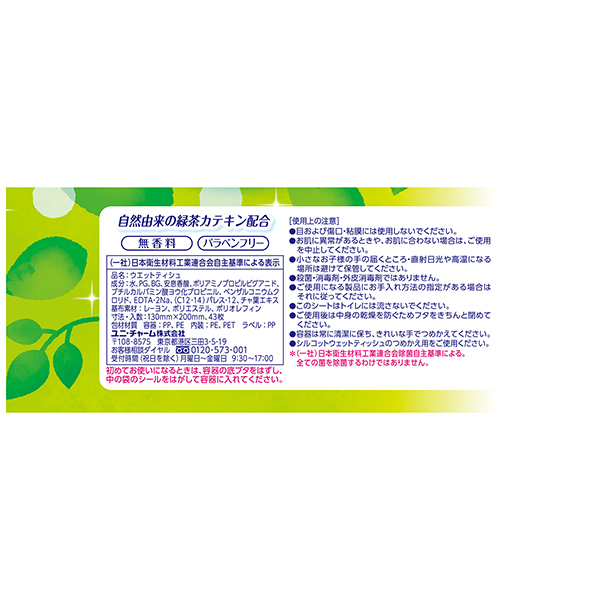 水、PG、BG、安息香酸、ポリアミノプロピルビグアニド、ブチルカルバミン酸ヨウ化プロピニル、ベンザルコニウムクロリド、EDTA-2Na、(C12-14)パレス-12、チャ葉エキス/基布素材:レーヨン、ポリエステル、ポリオレフィン/包材材質/容器:PP、PE/内装:PE、PET/ラベル:PP