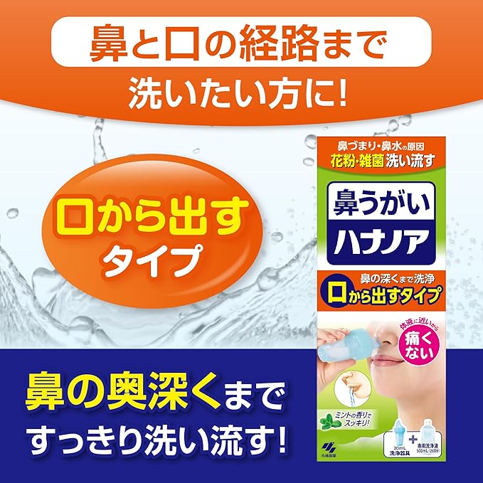 洗浄液を鼻から入れて口から出すので、鼻の奥深くに付着した花粉や雑菌をしっかり洗い流すことができます