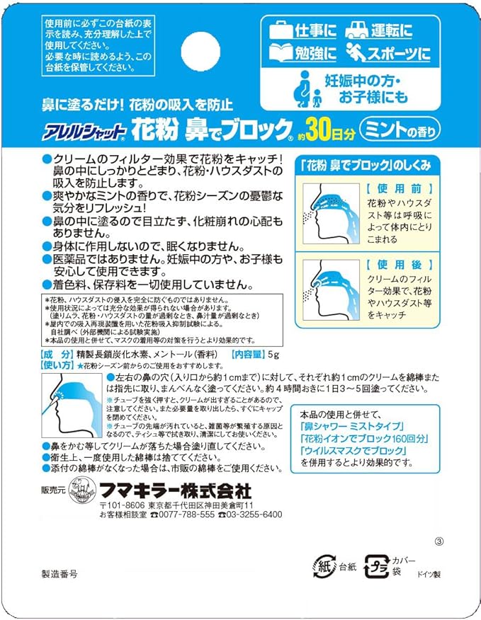 ●クリームの高密着フィルター効果で花粉をキャッチ!鼻の中にしっかりとどまり、花粉・PM2.5・黄砂・ハウスダストの吸入を防止します。
