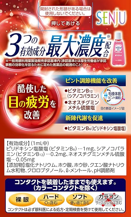 「目の疲れ」「目のかすみ(目やにの多い時など)」「コンタクトレンズを装着しているときの不快感」などに効果をあらわします。