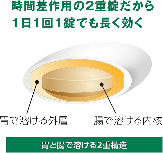 ●ストナリニSは、胃で溶ける外層と腸で溶ける内核からなる時間差作用の二重構造で、1日1~2回の服用ですぐれた効果をあらわします。